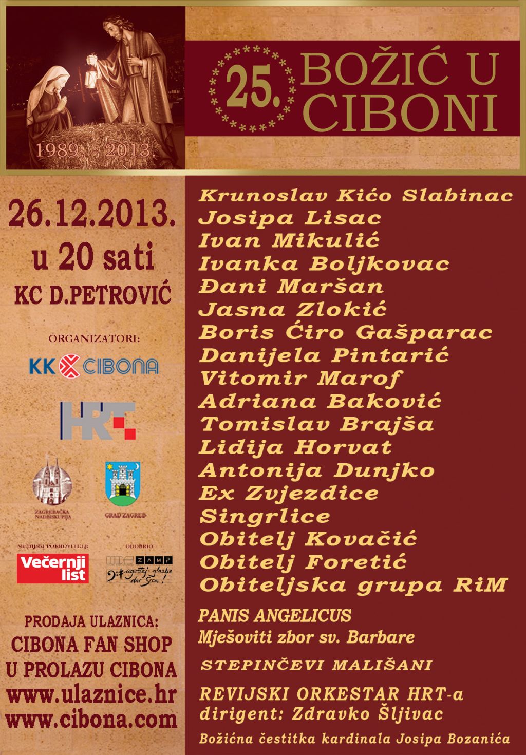 Tradicionalni 25. božićni koncert "Božić u Ciboni" u organizaciji KK Cibona, Zagrebačke nadbiskupije, Grada Zagreba i HRT-a održat će se u četvrtak, 26. prosinca u 20 sati u Košarkaškom centru Dražen Petrović u Zagrebu, uz izravni prijenos na Drugom programu Hrvatske televizije.