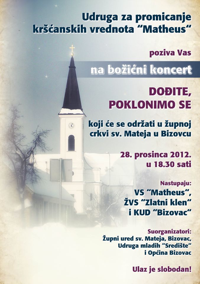 U organizaciji Udruge za promicanje kršćanskih vrednota „Matheus“, u župnoj crkvi sv. Mateja u Bizovcu u petak, 28. prosinca, održan je božićni koncert pod nazivom „Dođite, poklonimo se!“.
