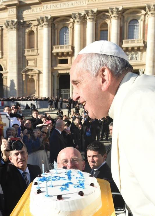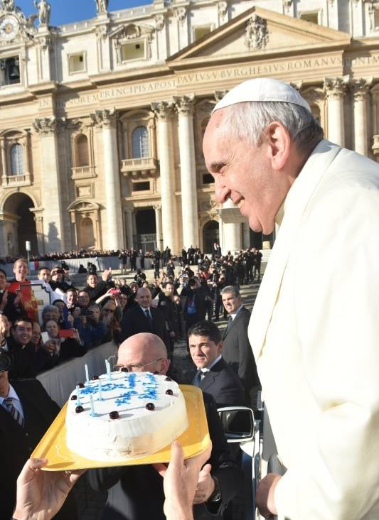 Dok je prolazio mnoštvom, Papu je zaustavila skupina sjemeništaraca Kristovih legionara, koji su mu predali rođendansku tortu, upotpunjenu sa zapaljenim svjećicama.