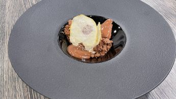 Priprema: Od kesten pirea, slatkog vrhnja i šećera u prahu napraviti parfe od kestena uz dodatak cimeta. Poslužiti iz dresir vrećice kao podlogu. Od prkkog tijesta i kakaa ispeći keks - 170 c 12 min u plehu na tanko. Kad se ohladi podrobiti ga i servirati s kestenom. Otopiti tamnu čokoladu i uz slatko vrhnje napraviti čoko umak. Krušku narezati na čips osušiti u pećnici 100 c 90 min. Krušku prije premazati sirupom i posuti cimetom. Servirati kao dekoraciju na kesten.