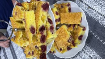 Priprema: Prvo umutiti snijeg od bjelanjaka. U žumanjke postepeno dodavati sve sastojke. Na kraju nježno umiješati bjelanjke miješajući drvenom žlicom. Izliti u veliki protvan s papirom za pečenje. Odmah gore posložiti višnje i marelice. Staviti peći u zagrijanu pećnicu 30 min na 180°C. Prilikom serviranja, tko voli, može posuti šećerom u prahu.