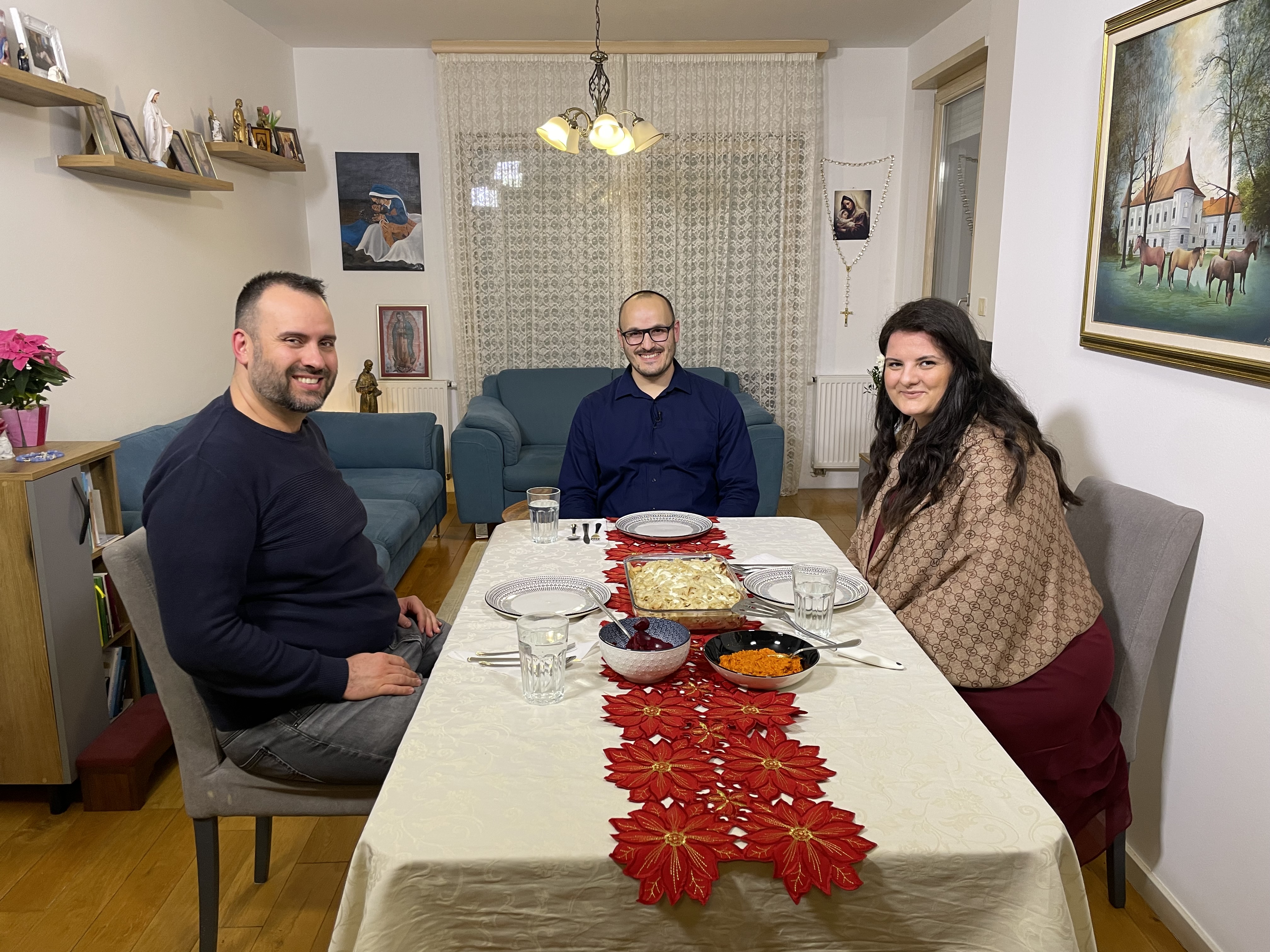 U Zaprešiću su nas ugostili Mila i Ivan Jakić, bračni par koji je proslavio sedam godina braka u kojem su blagoslovljeni s dvoje djece, Miriam i Alojzijem. Obitelj Jakić svjedoči o Bogorodičinoj školi ljubavi koju žive, Njoj su se predali u potpunosti, nema dana da ne izmole zajedno krunicu, a već godinama poste o kruhu i vodi srijedom i petkom, iz čega su proizišli brojni blagoslovi. U kulinarskom dijelu priprema se složenac od piletine i mlinaca s vrhnjem te zimska torta s božićnim keksima od cimeta.