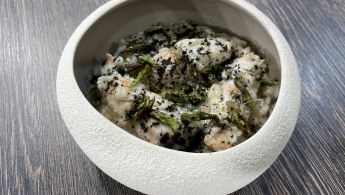 Chef Hrvoje Kroflin donosi proljetni jelovnik koji uključuje salatu od divljih šparoga, rižoto s medvjeđim lukom i škampima te raviole od čičoke s crnim lješnjakom.