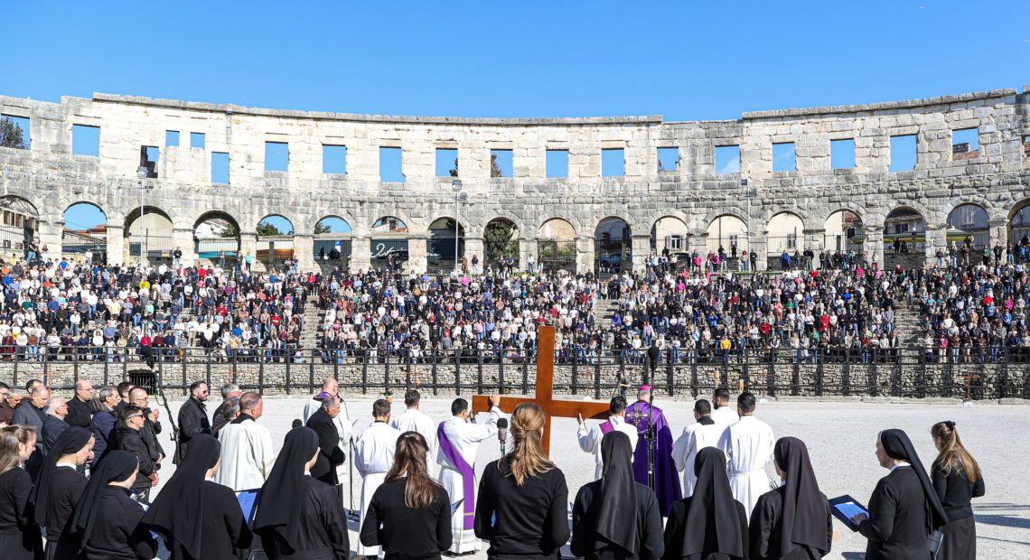 Mnoštvo vjernika sjatilo se u pulsku Arenu kako bi zajednički sudjelovali na Križnom putu Porečke i Pulske biskupije, u subotu 28. ožujka, uoči Cvjetnice. Križni put predvodio je porečki i pulski biskup mons. Ivan Štironja, prenosi IKA.