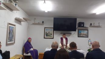 Nakon molitve održana je i sveta Misa u mjesnom vatrogasnom domu, koju je također predslavio biskup, dok je propovijed održao domaći župnik iz Gline, Saša Jozić.