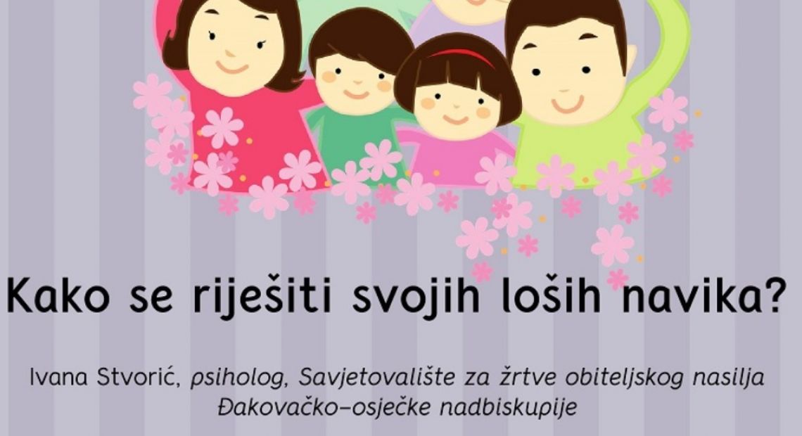 Putem ZOOM platforme o temi 'Kako se riješiti svojih loših navika?' govorit će Ivana Stvorić, psihologinja iz Savjetovališta za žrtve obiteljskog nasilja Đakovačko-osječke nadbiskupije. Zbog ograničenog broja sudionika, za sudjelovanje na svakom pojedinom webinaru potrebno je prijaviti se slanjem e-pošte na e-adrese: son@djos.hr, savjetovaliste-sb@djos.hr; savjetovaliste-os@djos.hr.
