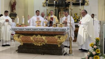 Svečanu euharistiju predslavio je đakovačko-osječki pomoćni biskup mons. Ivan Ćurić. Na početku mise župnik Zvonko Mrak, zajedno sa župnim vikarom Lukom Ćosićem, srdačno je pozdravio nazočne uzvanike. Čestitao je časnim sestrama blagdan i stogodišnjicu osnutka Družbe uz želju da ih uz Božji blagoslov prati i zagovor, primjer i nadahnuće bl. Marije Petković.