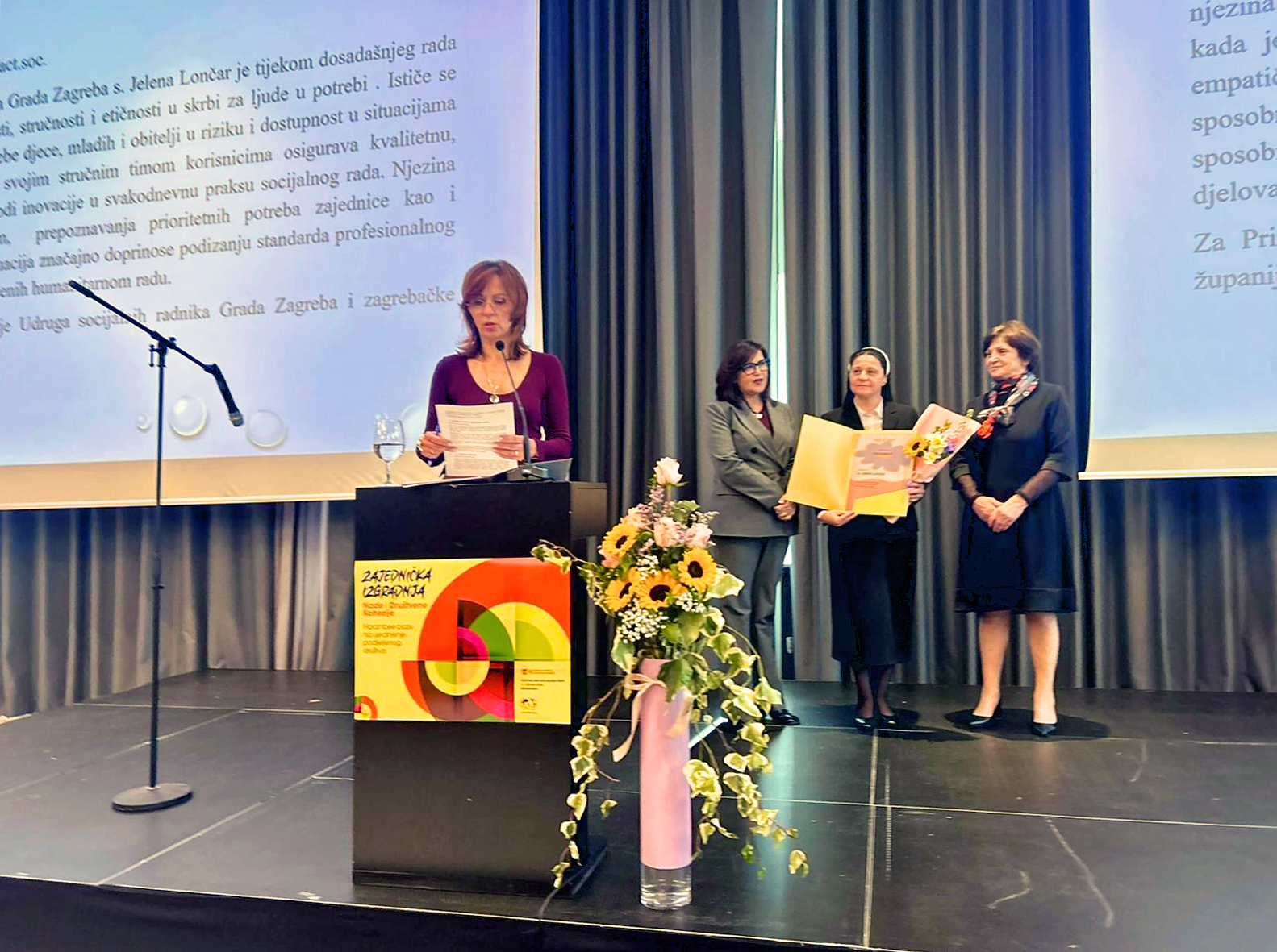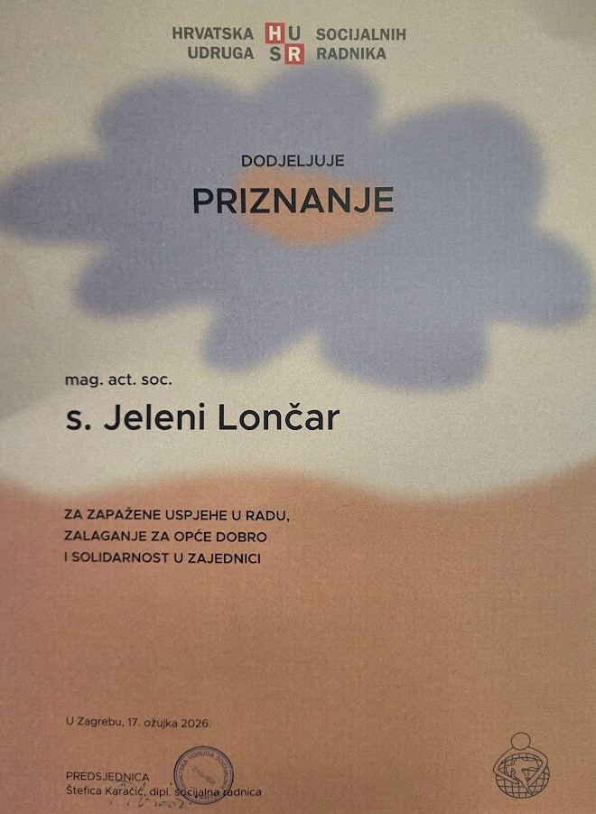 Među nagrađenima našla se i ravnateljica Caritasa Zagrebačke nadbiskupije, mag. act. soc. sestra Jelena Lončar, kojoj je priznanje uručeno za za zapažene uspjehe u radu, zalaganje za opće dobro i solidarnost u zajednici. Za ovu nagradu predložila ju je Udruga socijalnih radnika Grada Zagreba i Zagrebačke županije.