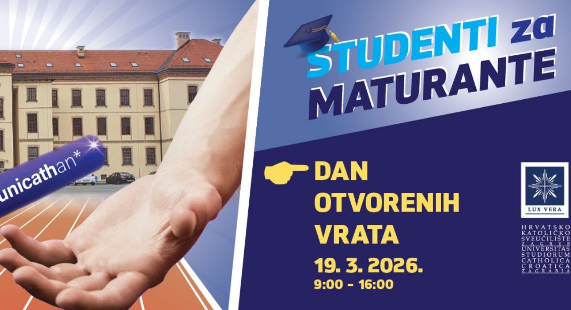Dan otvorenih vrata Hrvatskog katoličkog sveučilišta održat će se u četvrtak, 19. ožujka 2026. godine, od 9 do 16 sati na Kampusu Hrvatskog katoličkog sveučilišta (Ilica 244, Zagreb).Ovogodišnji Dan otvorenih vrata održava se pod nazivom ''Studenti za maturante'', jer su upravo studenti najbolji promotori studijskih programa i studentskog života na Kampusu.