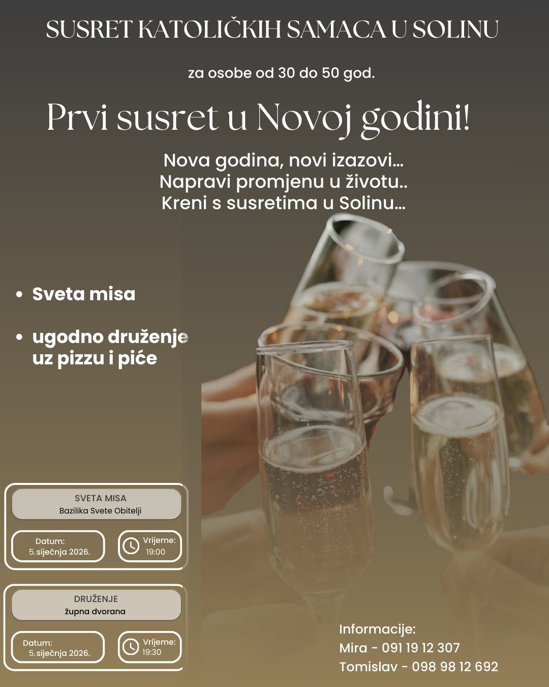 U Župi Gospe od Otoka u Solinu svakog prvog ponedjeljka u mjesecu održavaju se susreti za samce od 30 do 50 godina, a prvi susret u novoj godini održat će se 5. siječnja. U 19 sati započet će euharistijsko slavlje, a nakon toga slijedi druženje u župnoj dvorani.