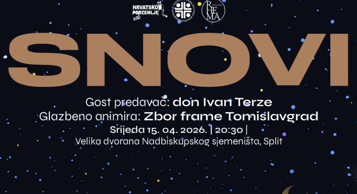 Hrvatsko nadzemlje poziva na susret pod nazivom "SNOVI" koji će se održati ove srijede u Splitu. Program započinje u 20:30 sati u Velikoj dvorani Nadbiskupskog sjemeništa, na adresi Zrinsko Frankopanska 19.
